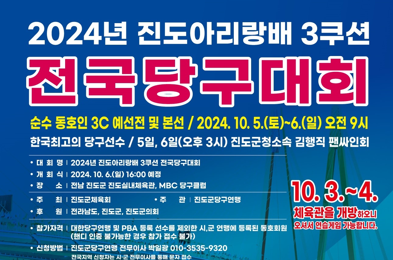 진도군당구연맹(회장 김연일)은 오는 10월 5~6일 개최하는 ‘2024년 진도아리랑배 3쿠션 전국당구대회’의 요강을 발표했다.